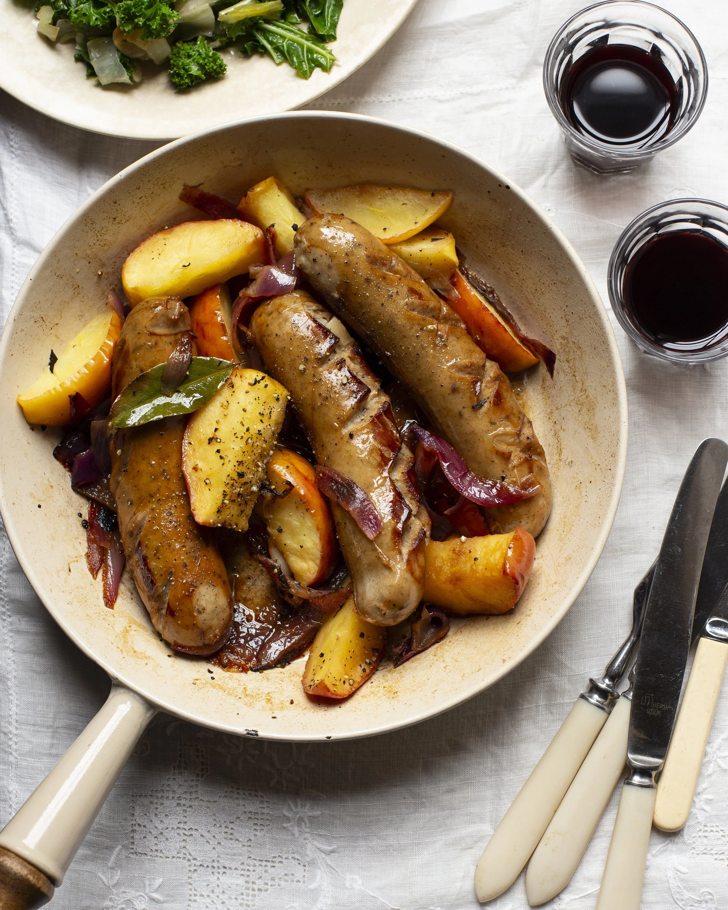 If you need a cozy fall dinner that feels a little European but is incredibly simple to make, this German sausage and apple recipe is it. Snappy sausages are browned until golden, then simmered with sweet apples, red onion, Riesling, and a splash of balsamic vinegar until glossy and sticky. It’s the kind of one-pan meal that tastes like fall but works just as well for dinner any time of the year. Serve it with sautéed greens and a glass of port, and you have the easiest cold-weather supper.